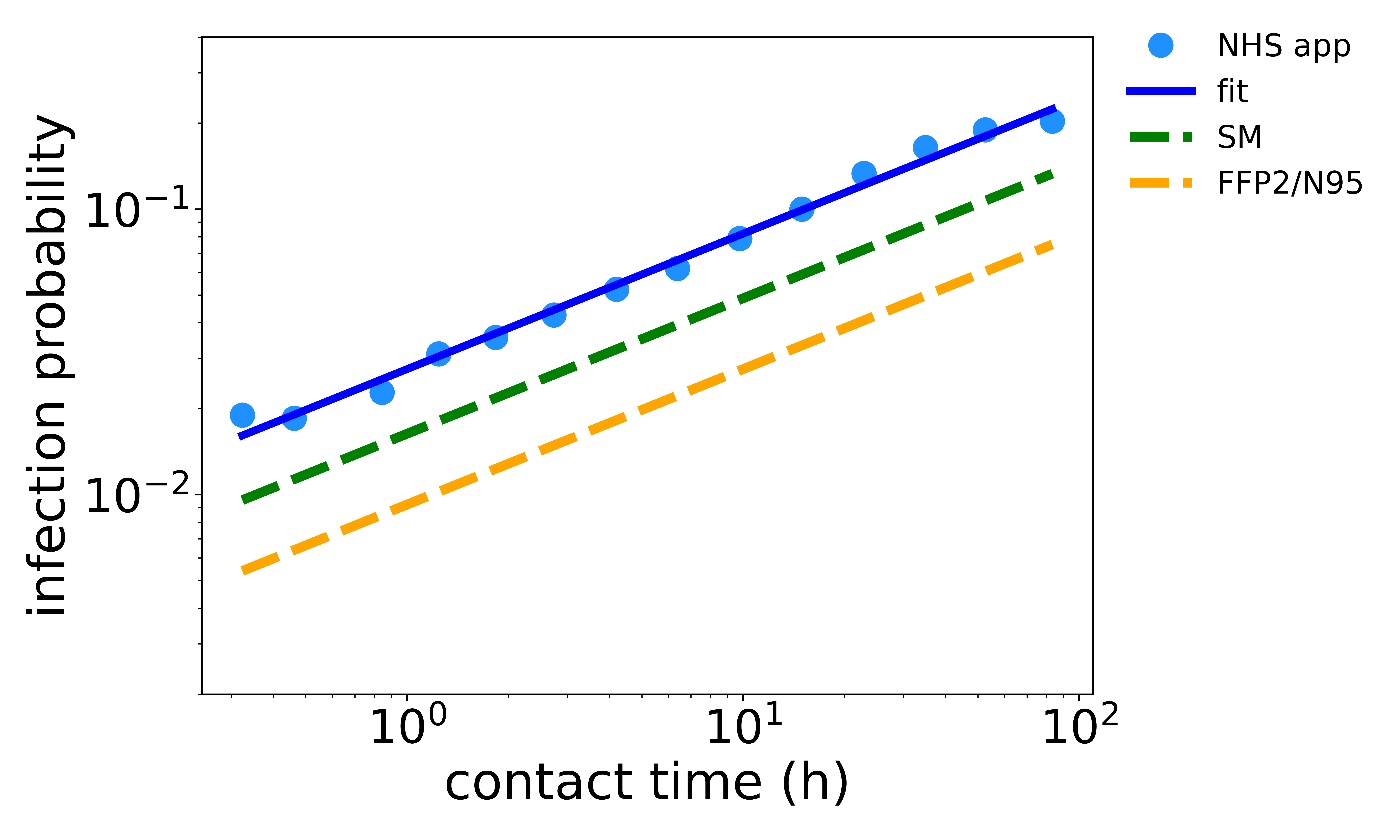 This is approximately independent of the duration of the contact between you and an infected person – as shown by the green line showing the model prediction above, which is parallel to the fit to the data. The orange line shows the prediction for wearing a surgical mask (SM), these are much less effective, so reduce the risk by much less.
